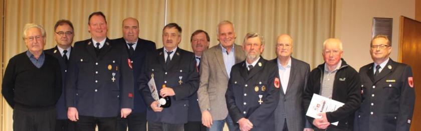 Für langjährige Mitgliedschaft wurden geehrt (von links): Dieter Zurek (25 Jahre), Georg Helfrich (Kommandant), Manfred Müller (40 Jahre), Karl Willi Müller (40 Jahre), Christian Breitenbach (45 Jahre), Wolfgang Schmid (45 Jahre), Dieter Gundelach (50 Jahre), Walter Erb (50 Jahre), Walter Gutmann (50 Jahre), Georg Gundelach (65 Jahre).